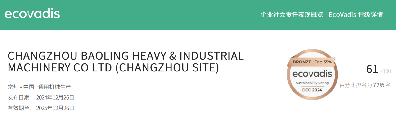 2024年12月26日,寶菱重工在EcoVadis企業(yè)社會(huì)責(zé)任評(píng)估中得分61分,并榮獲“銅牌”,在EcoVadis所有在評(píng)公司中躋身于前 35%(已超過(guò) 65% 以上的公司)。當(dāng)前,“環(huán)境、社會(huì)責(zé)任和公司治理”(簡(jiǎn)稱:ESG)水平已成為衡量企業(yè)長(zhǎng)期價(jià)值和可持續(xù)發(fā)展能力的關(guān)鍵因素,其核心在于“友好環(huán)境、尊重員工、合規(guī)經(jīng)營(yíng)、可持續(xù)發(fā)展”。公司將可持續(xù)發(fā)展理念融入企業(yè)戰(zhàn)略與日程經(jīng)營(yíng)活動(dòng)中,推動(dòng)導(dǎo)入ESG